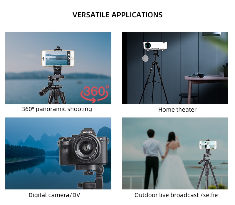 *Chân máy chiếu mini Tripod VCT được thiết kế có thể điều chỉnh được độ cao lý tưởng cho các loại máy chiếu mini, độ cao linh hoạt từ 43 tới 165cm+. Chân máy VCT có cần xoay 360 độ, điều chỉnh được mọi góc độ chiếu từ chiếu thẳng đến chiếu chéo hoặc chiếu ngửa vuông góc lên trần nhà để xem phim.