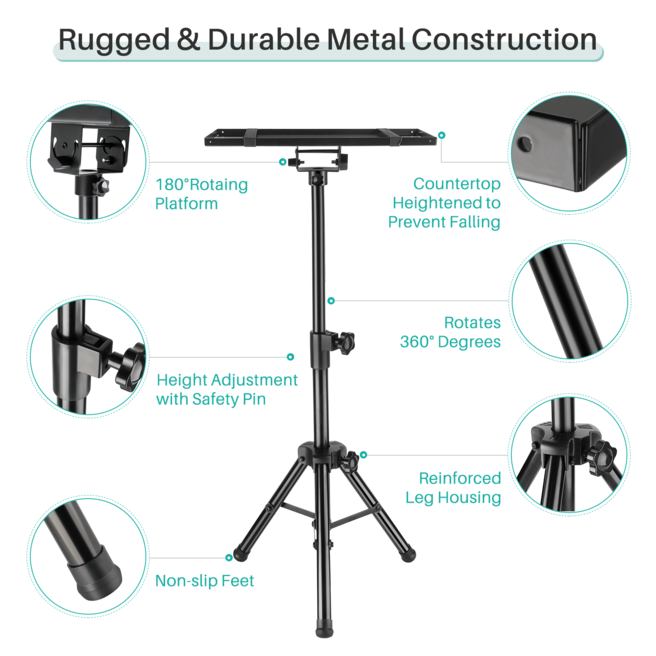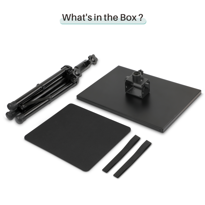 Khay đỡ điều chỉnh độ nghiêng: Giá ba chân chắc chắn đi kèm với một khay kim loại (kích thước 38 x 28cm) có thể điều chỉnh độ nghiêng tới 180° và một dây đàn hồi để giữ máy chiếu, laptop cố định. Bên trên khay là thảm chống trượt, chống xước mềm mại.