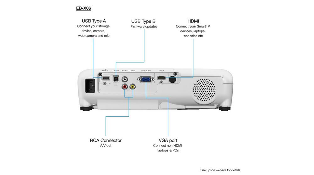 Ở phía sau máy chiếu Epson EB-X06 được tích hợp các cổng nguồn, cổng USB Type-A, cổng Mini USB Type-B và cổng 1HDMI 1.4 cho khả năng kết nối đa dạng, độ tương thích cao với nhiều thiết bị, luôn mang đến sự tiện lợi bất ngờ cho các buổi thuyết trình của bạn.
