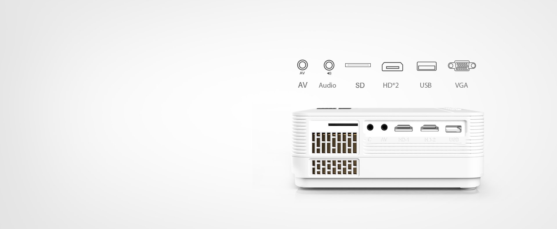 Máy chiếu tại gia cao cấp: Máy chiếu mini cung cấp kích thước xem từ 39 inch đến 250 inch với khoảng cách chiếu từ 1.3m đến 8m. Nguồn sáng bảo vệ mắt và loa âm thanh nổi 3W*1 tích hợp cho phép bạn thưởng thức tại nhà những bộ phim chất lượng như đang xem tại rạp chiếu phim.
