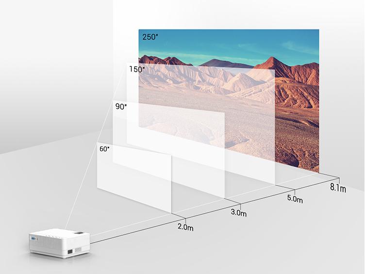 Đắm chìm bởi chất lượng và ấn tượng với kích thước chiếuVới kích thước màn hình chiếu tối đa là 250 inch và khoảng cách chiếu từ 1.3 đến 8m, Vankyo Leisure 470 có thể biến phòng khách của bạn thành một rạp chiếu phim mini.