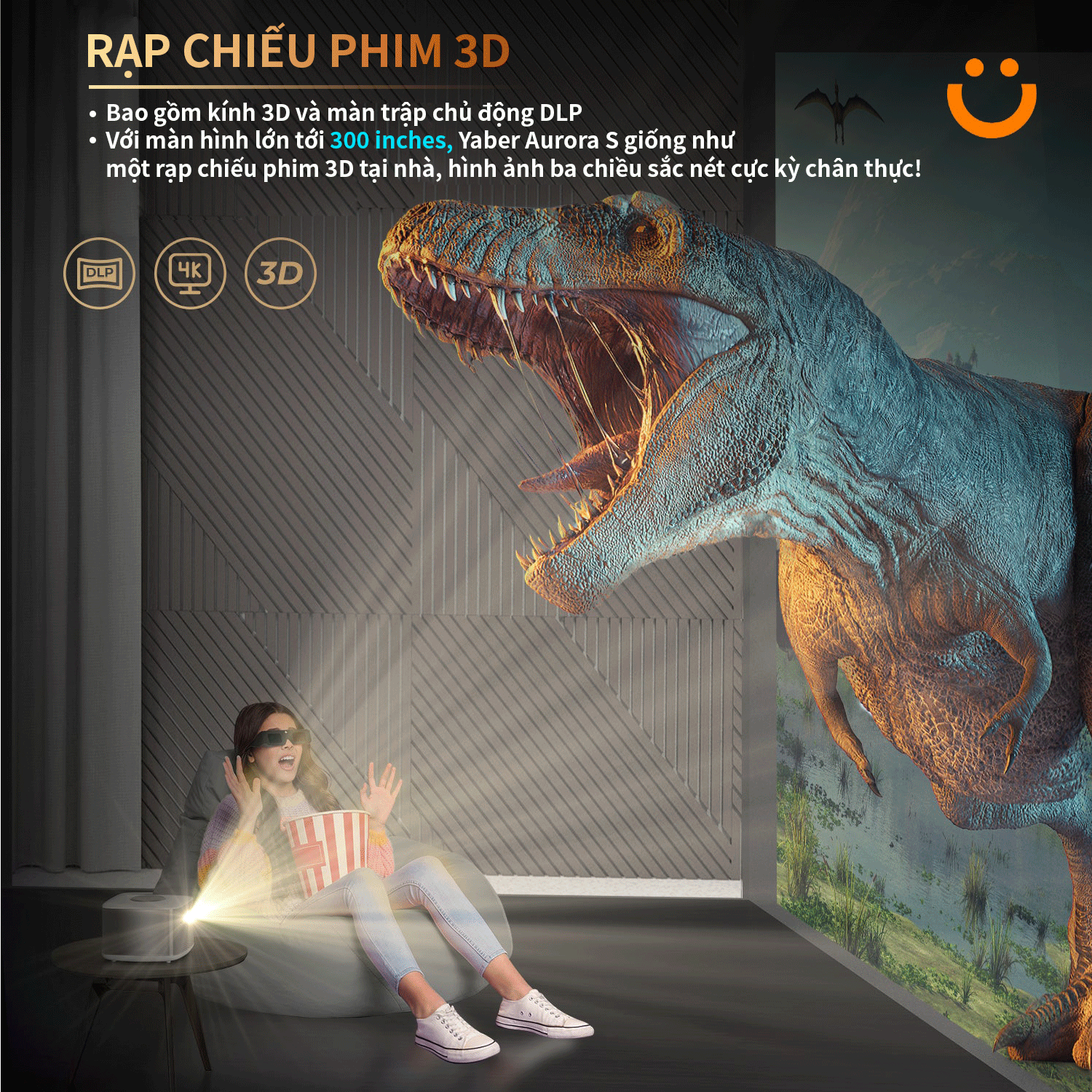 Bộ xử lý hình ảnh BASIC Smart Engine 3D của Yaber được trang bị để Aurora-S có thể chiếu phim 3D với nhiều định dạng khác nhau, đây là tính năng mà chỉ một số ít các loại máy chiếu giải trí cao cấp nhất hiện nay mới có được. Đi kèm với kính 3D màn trập chủ động DLP-Link, Aurora S sẵn sàng cho một rạp chiếu phim 3D ngay tại ngôi nhà của bạn.